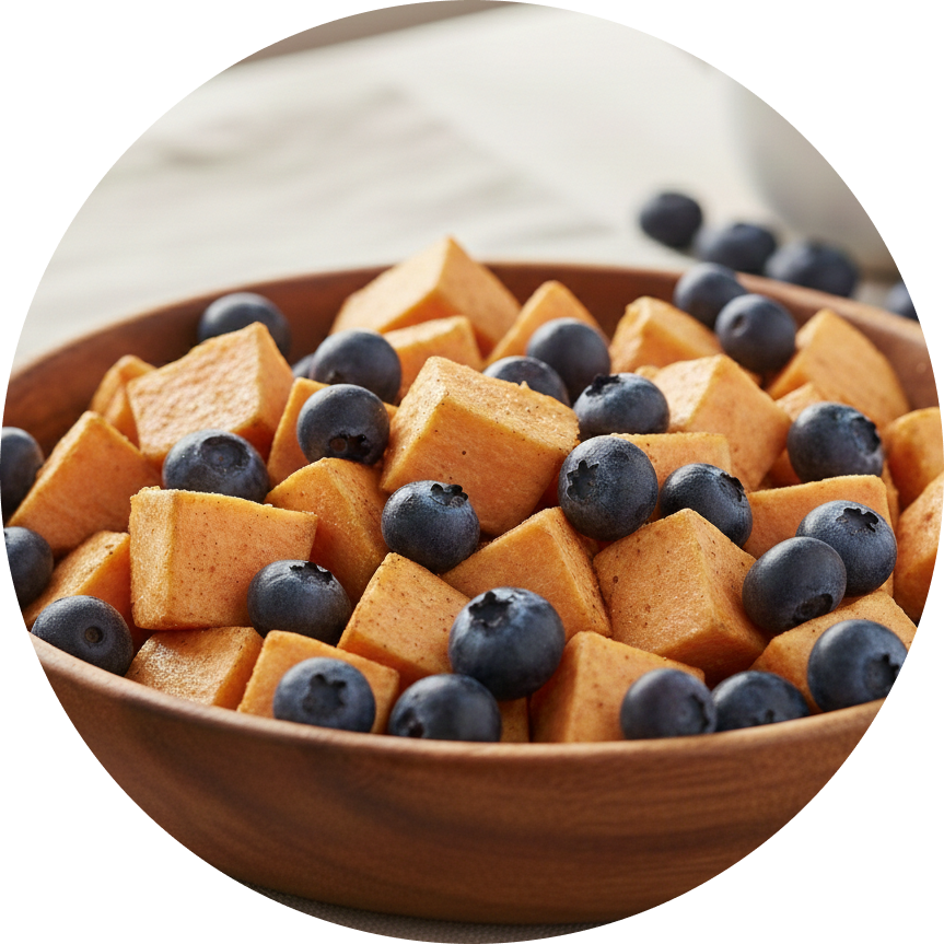 Functional ingredients like sweet potato and blueberries to fuel gut health, antioxidants, and balanced energy.